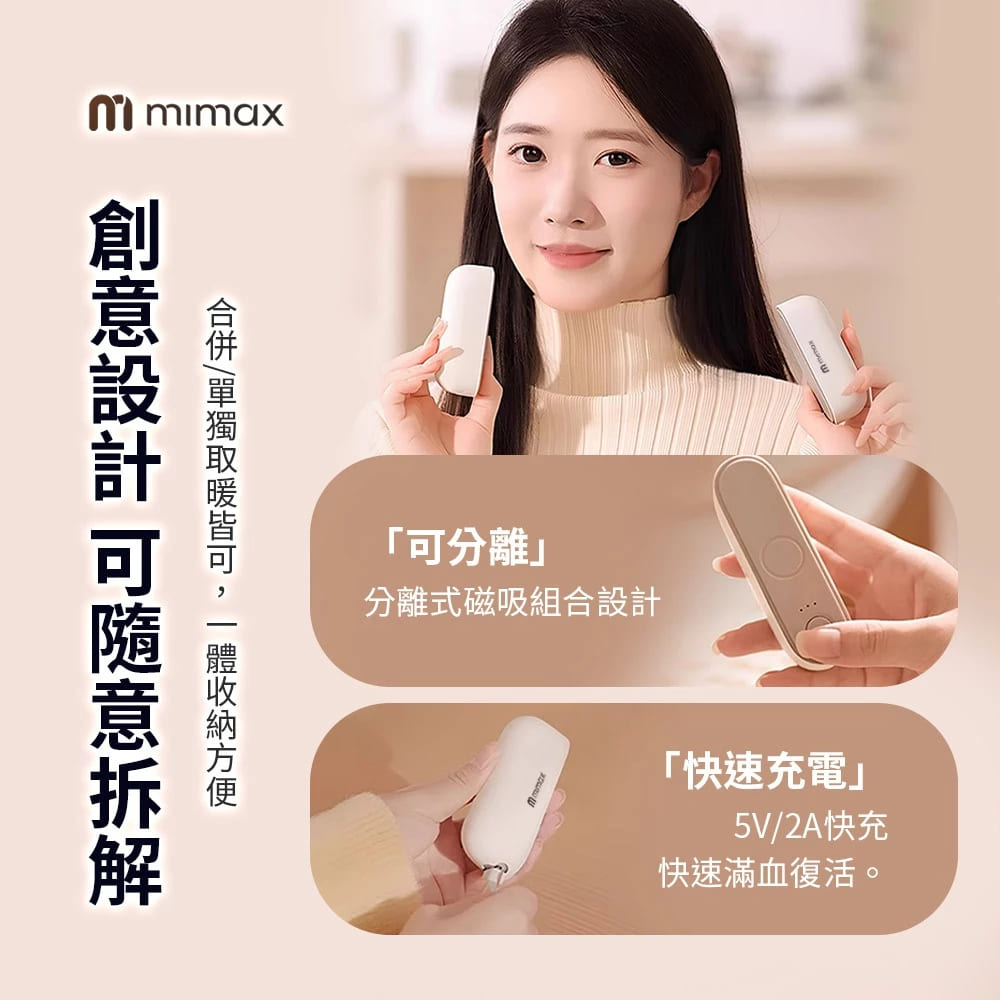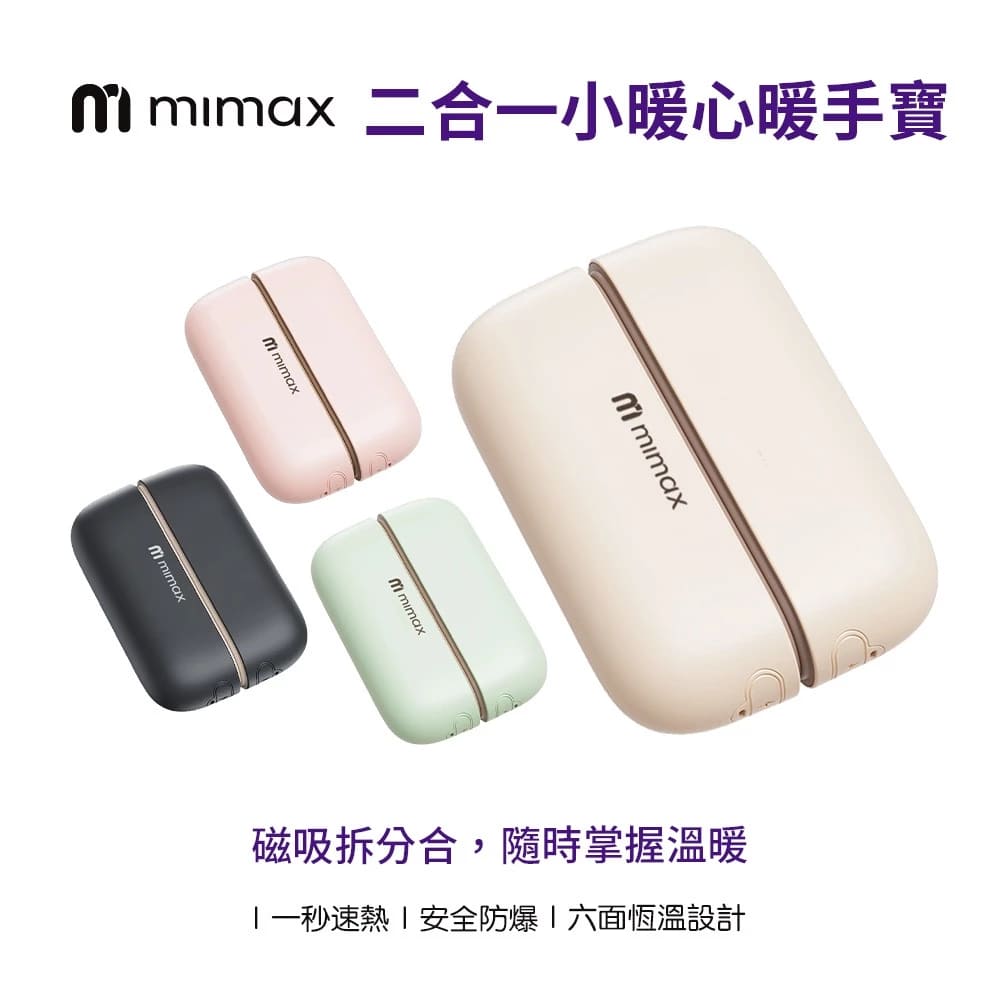 品名 : 磁吸暖手寶型號 : A401材質 : 鋁合金+矽膠+電子元件顏色 : 黑/白/粉/綠尺寸 : 9.5x3x3.5cm(單邊) / 9.5x7x3cm(雙邊合體)重量 : 220g電壓 : 5V/2A功率 : 10W檔位 : 三檔溫度 : 45℃/55℃/60℃(±5℃)內建電量 : 單邊3000mAh;兩邊共6000mAh充電方式 : Type-C操作方式 : 按鍵操作包裝尺寸 : 11.5x4x12.5cm包裝重量 : 300g