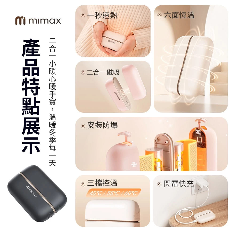 📢產品特色🔹3秒速熱 迅速溫暖雙手🔹鋁合金材質 智能恆溫🔹三檔溫度調整 一鍵切換🔹磁吸組合設計 分開使用溫暖左右手